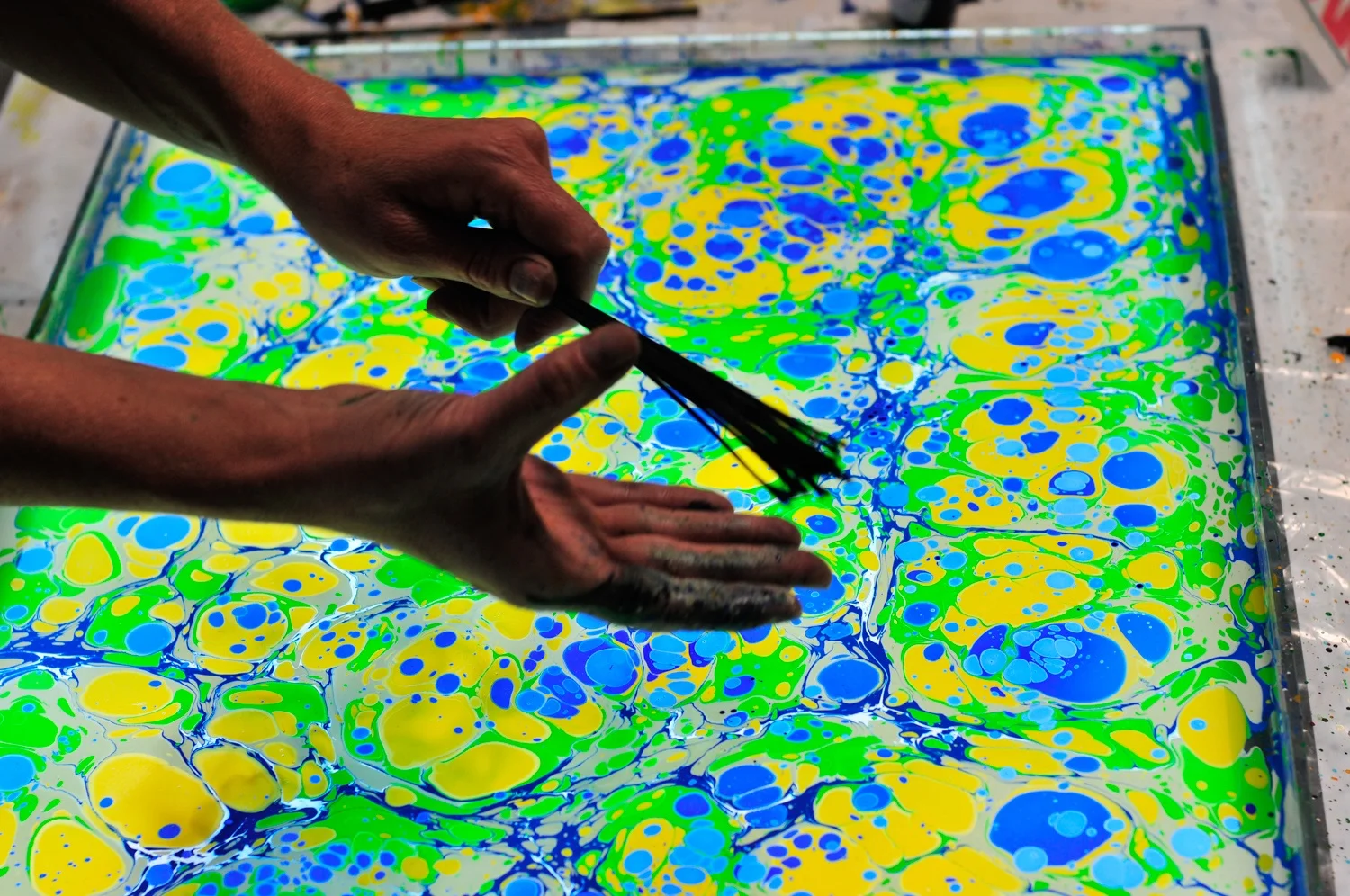 This class combines the Experience the Tank and Beginning Marbling classes but goes deeper into marbling by learning more advanced patterns, marbling on a wider variety of mediums, and marbling in all three tank sizes. It is designed for beginners as well as those who want to expand their marbling practice.