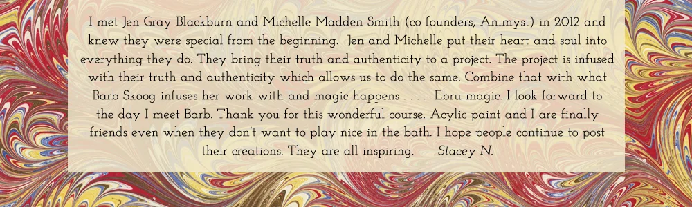 ““Mesmerizing, meditative, fun....these are the three words that keep coming up for me as I edit the videos for our latest colorful collaboration Clouds on Water. Barb Skoog is a passionate, engaging, firecracker of a teacher and artist. I’m not sure I’ve met anyone with quite as much delightful enthusiasm when it comes to sharing their process. Marbling is a centuries-old tradition and yet Barb brings it into our modern day experience with ease and grace.” —Michelle Madden Smith (co-founder, Animyst)”